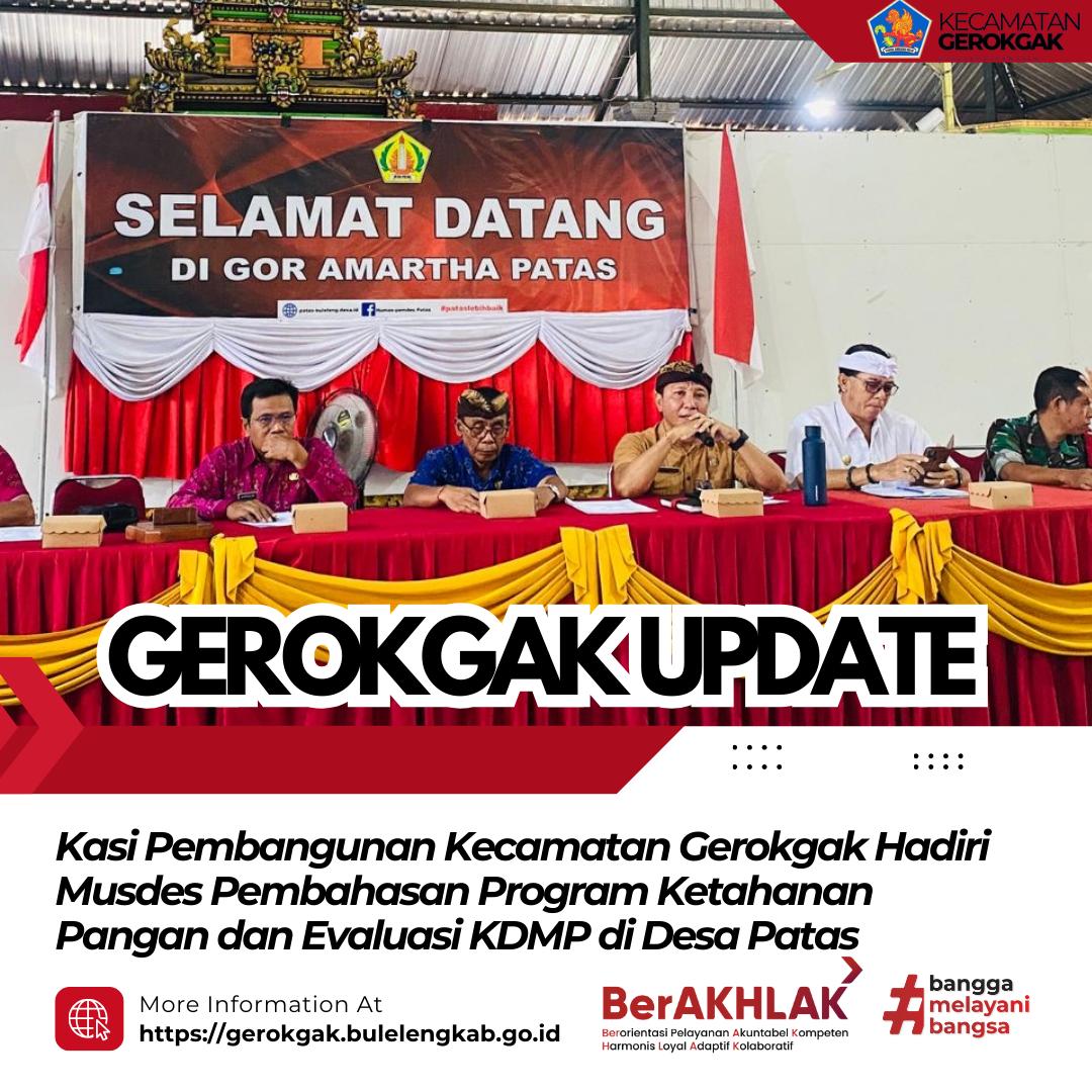 Patas, 5 Maret 2026 – Kepala Seksi Pembangunan Kecamatan Gerokgak beserta staf menghadiri kegiatan Musyawarah Desa (Musdes) yang membahas perumusan tematik program ketahanan pangan BUMDes Artha Mandiri, evaluasi KDMP Patas, serta verifikasi dan validasi Data Terpadu Satu Sosial Ekonomi Nasional (DTSEN). Kegiatan tersebut dilaksanakan di GOR Amertha Desa Patas.