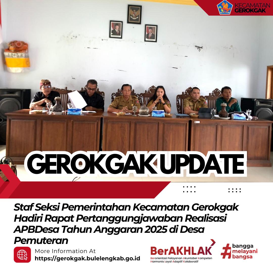 Pemuteran, Senin (19 Januari 2026) — Staf Seksi Pemerintahan Kecamatan Gerokgak menghadiri Rapat Pertanggungjawaban Realisasi Anggaran Pendapatan dan Belanja Desa (APBDesa) Tahun Anggaran 2025 yang diselenggarakan di Desa Pemuteran. Kegiatan ini merupakan bagian dari upaya mewujudkan transparansi dan akuntabilitas pengelolaan keuangan desa.