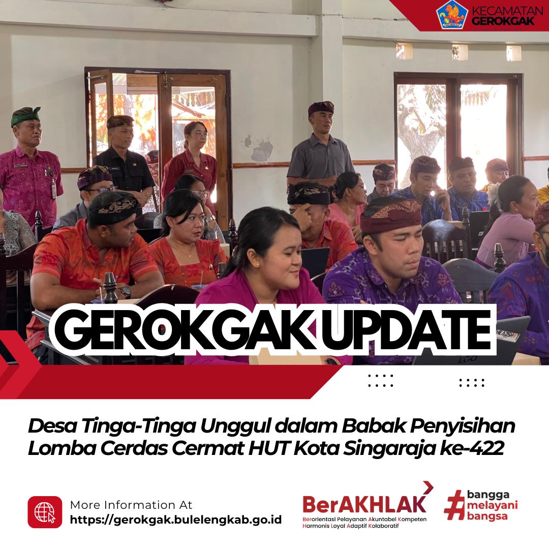 Setelah melalui persaingan yang cukup ketat dalam babak penyisihan, Desa Tinga-Tinga berhasil meraih nilai tertinggi dan keluar sebagai pemenang. Dengan hasil tersebut, Desa Tinga-Tinga ditetapkan sebagai duta Kecamatan Gerokgak untuk melanjutkan ke tahap selanjutnya pada Lomba Cerdas Cermat tingkat Kabupaten dalam rangka HUT Kota Singaraja ke-422.