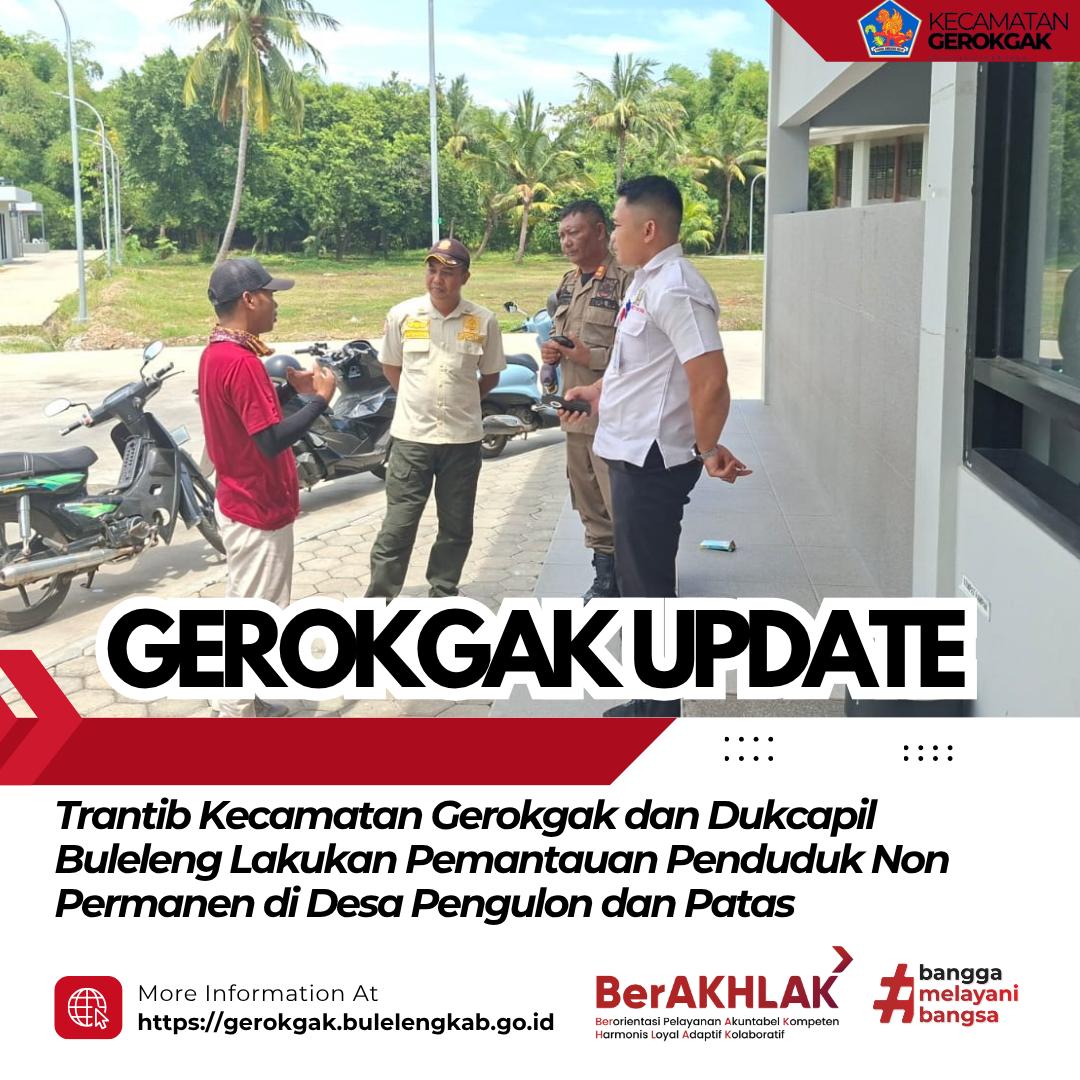 Gerokgak, 12 November 2025 – Dalam rangka menjaga ketertiban administrasi kependudukan serta menciptakan situasi wilayah yang aman dan kondusif, anggota Seksi Trantib dan Satpol PP Kecamatan Gerokgak bersama Tim dari Dinas Kependudukan dan Pencatatan Sipil (Dukcapil) Kabupaten Buleleng melaksanakan kegiatan pemantauan penduduk pendatang (duktang) di dua lokasi, yaitu Desa Pengulon dan Desa Patas, Kecamatan Gerokgak.