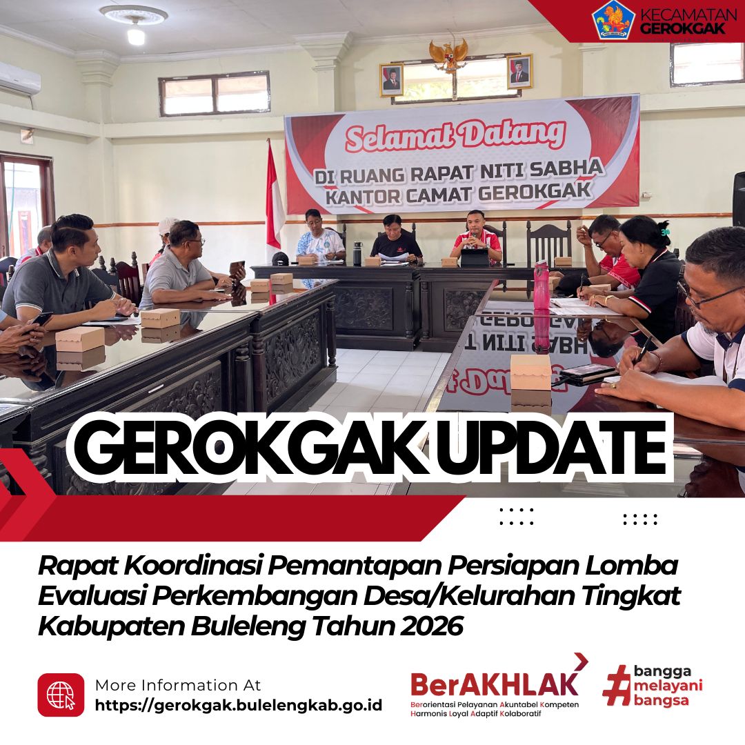 Gerokgak, 20 Februari 2026 – Bertempat di Ruang Rapat Niti Sabha Kantor Camat Gerokgak, dilaksanakan Rapat Koordinasi Pemantapan Persiapan Lomba Evaluasi Perkembangan Desa/Kelurahan Tingkat Kabupaten Buleleng Tahun 2026 pada Jumat (20/2).