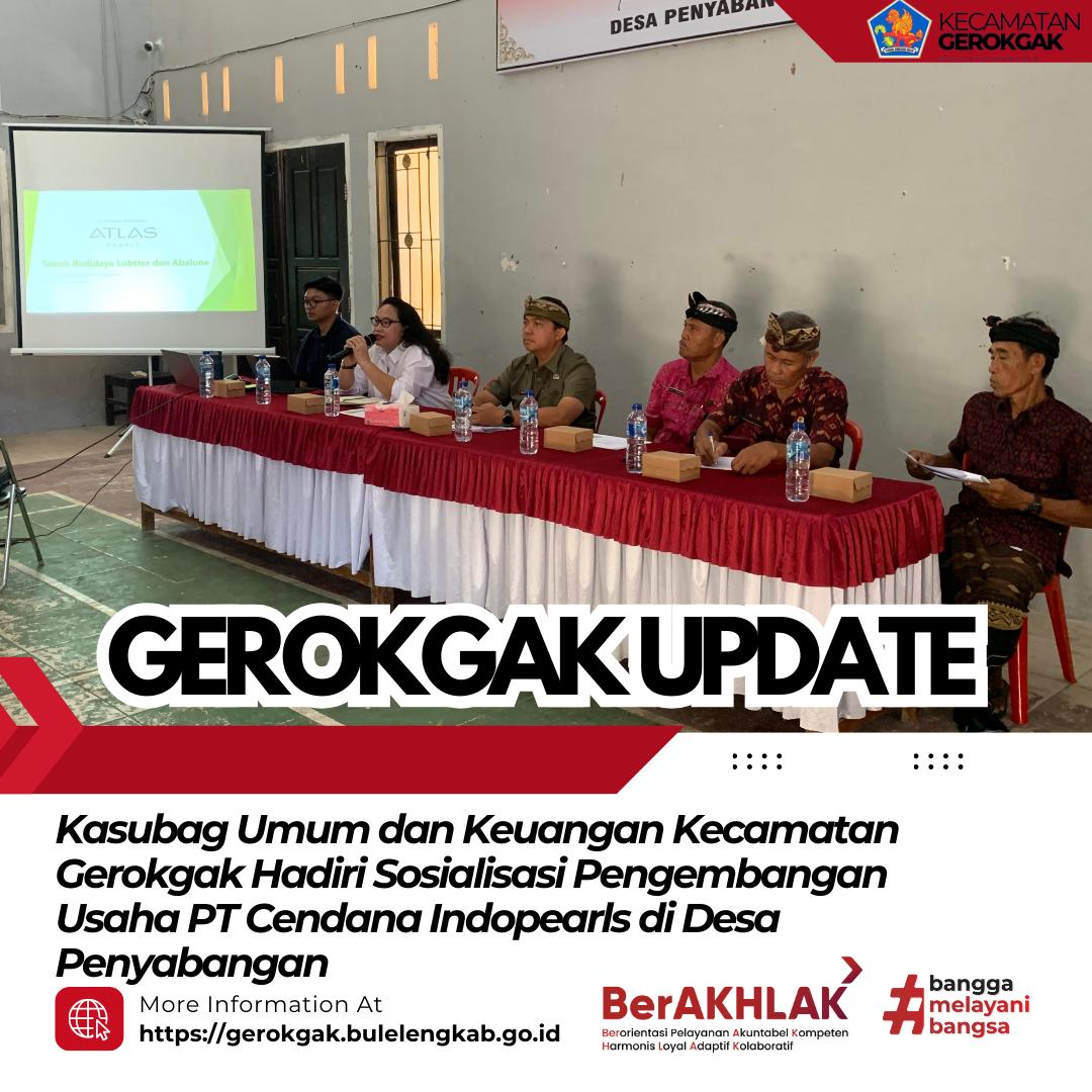 Penyabangan, 25 September 2025 — Kasubag Umum dan Keuangan Kecamatan Gerokgak, I Gusti Putu Mangkuyasa, menghadiri kegiatan sosialisasi pengembangan usaha PT. Cendana Indopearls yang dilaksanakan di Desa Penyabangan. Dalam sosialisasi tersebut dipaparkan rencana pengembangan usaha berupa satu blok untuk abalone serta satu blok untuk lobster mutiara dan lobster pasir.