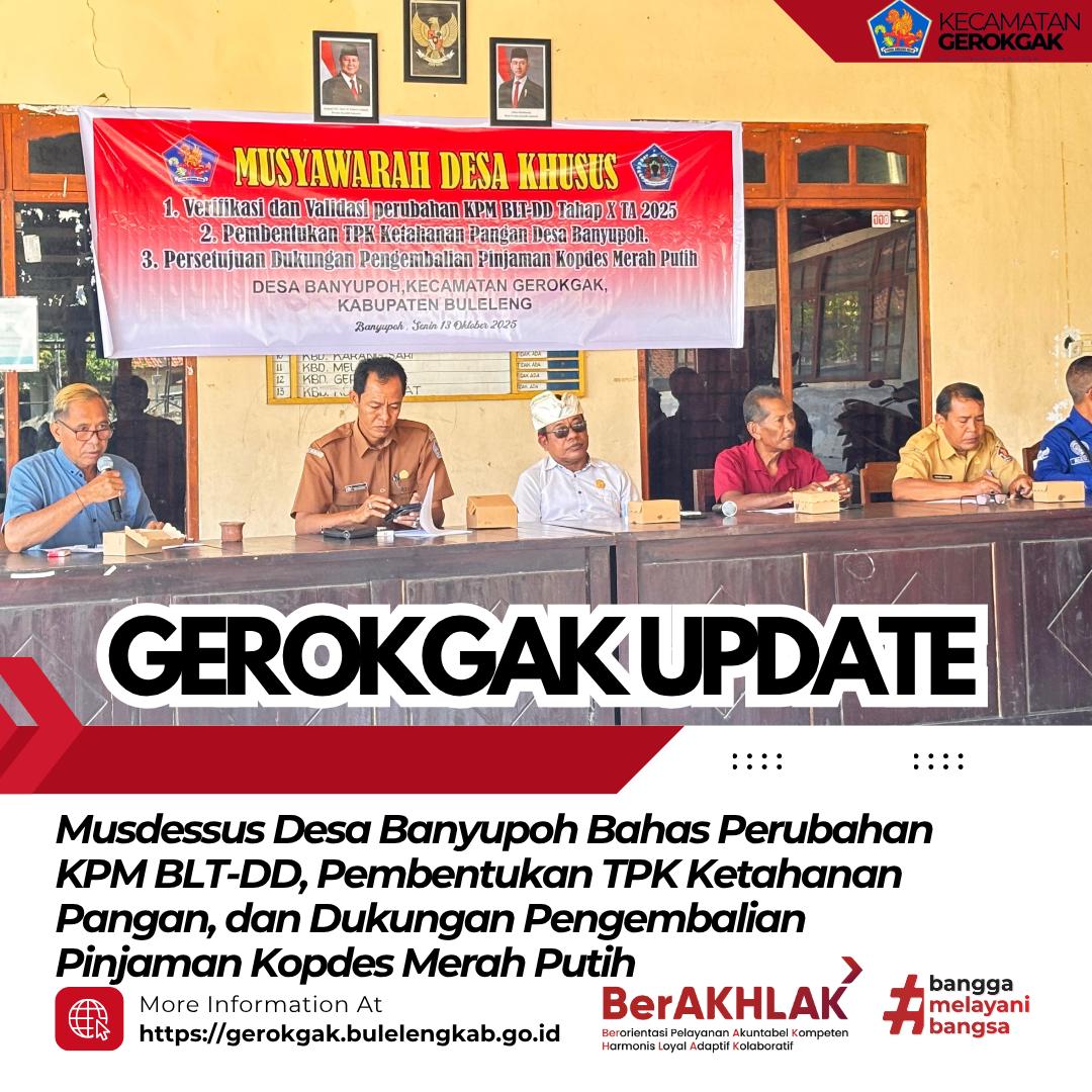 Banyupoh, Senin (13/10/2025) — Staf Seksi Sosial dan Budaya Kecamatan Gerokgak menghadiri Musyawarah Desa Khusus (Musdessus) yang dilaksanakan di Desa Banyupoh. Kegiatan ini membahas tiga agenda utama, yaitu verifikasi dan validasi perubahan Keluarga Penerima Manfaat (KPM) BLT Dana Desa tahap X Tahun Anggaran 2025, pembentukan Tim Pelaksana Kegiatan (TPK) Ketahanan Pangan Desa Banyupoh, serta persetujuan dukungan pengembalian pinjaman Kopdes Merah Putih.