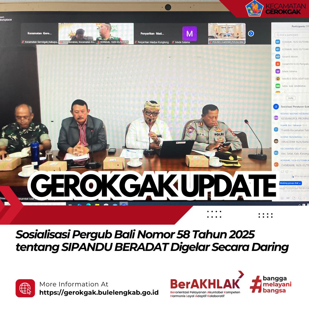 Gerokgak, Jumat, 23 Januari 2026 — Pemerintah Provinsi Bali melaksanakan Sosialisasi Peraturan Gubernur Bali Nomor 58 Tahun 2025 tentang Perubahan atas Peraturan Gubernur Bali Nomor 26 Tahun 2020 mengenai Sistem Pengamanan Lingkungan Terpadu Berbasis Desa Adat (Sipandu Beradat). Kegiatan ini dilaksanakan secara daring pada pukul 10.00 WITA sampai dengan selesai dan diikuti oleh Staf Seksi Trantib dan Pol PP Kecamatan Gerokgak di Ruang Kerja Trantib.