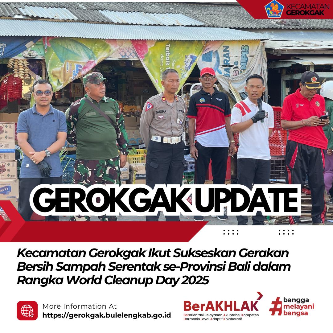 Gerokgak, 26 September 2025 – Pemerintah Kecamatan Gerokgak melaksanakan Gerakan Buleleng Bersih Sampah di kawasan Pasar Gerokgak pada Jumat (26/9). Kegiatan ini merupakan bagian dari aksi serentak yang digelar di seluruh Provinsi Bali dalam rangka World Cleanup Day Tahun 2025 dengan tema “Menuju Indonesia Bersih 2029”.