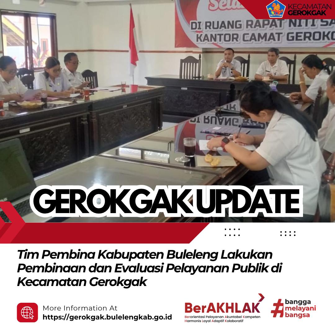Gerokgak, Rabu (15 Januari 2025) — Tim Pembina Pelayanan Publik Kabupaten Buleleng melaksanakan kegiatan Pembinaan dan Evaluasi Pelayanan Publik di Kantor Kecamatan Gerokgak. Kegiatan ini dibuka oleh Sekretaris Camat (Sekcam) Gerokgak yang dalam arahannya menyampaikan gambaran umum kondisi serta situasi pelayanan publik di Kecamatan Gerokgak.