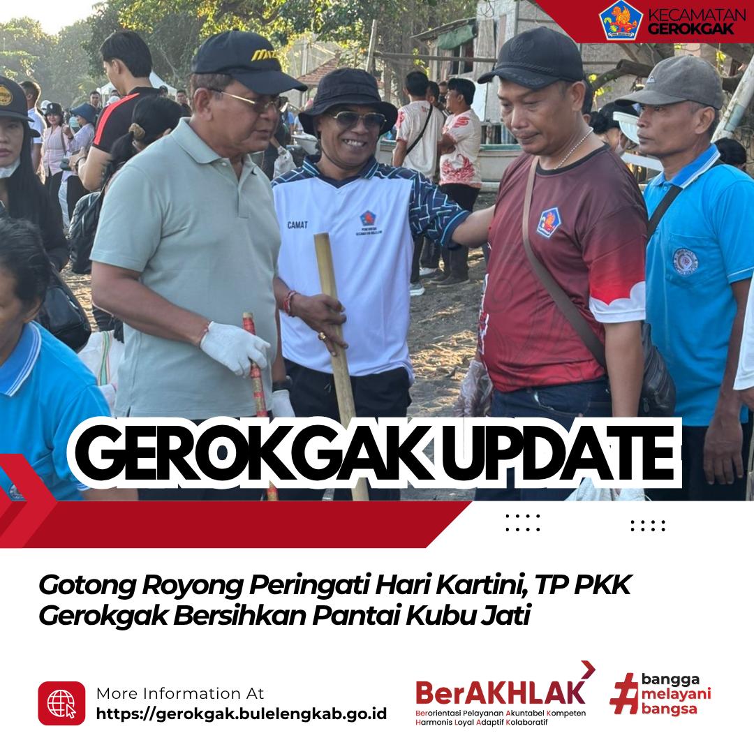 Buleleng – Ketua TP PKK Kecamatan Gerokgak yang juga menjabat sebagai Ketua Unsur DWP Kecamatan Gerokgak bersama anggota melaksanakan kegiatan gotong royong dalam rangka memperingati Hari Kartini. Kegiatan ini dilaksanakan di Pantai Kubu Jati, Desa Penarukan, Kecamatan Buleleng, pada Jumat (17/4).