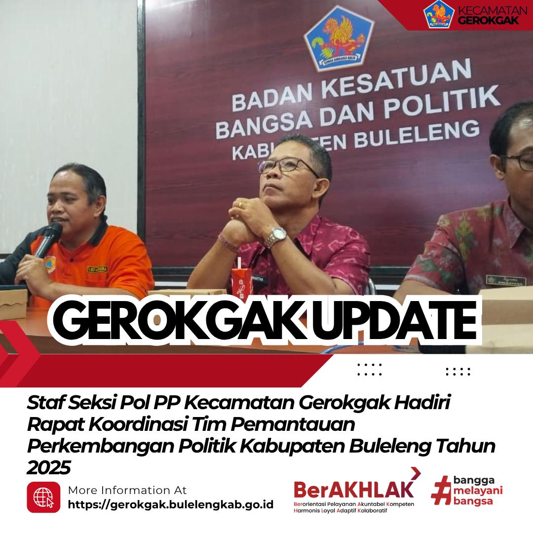 Buleleng, 11 November 2025 — Staf Seksi Polisi Pamong Praja (Pol PP) Kecamatan Gerokgak menghadiri Rapat Koordinasi Tim Pemantauan Perkembangan Politik Kabupaten Buleleng Tahun 2025, yang diselenggarakan oleh Badan Kesatuan Bangsa dan Politik (Bakesbangpol) Kabupaten Buleleng, pada Selasa (11/11), bertempat di Ruang Rapat Bakesbangpol Kabupaten Buleleng.