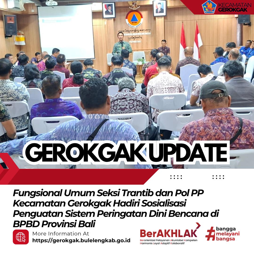 Selasa, 7 Oktober 2025, Fungsional Umum Seksi Trantib dan Pol PP Kecamatan Gerokgak, Ida Ketut Baruna, bersama satu orang anggota menghadiri kegiatan Sosialisasi Peningkatan Ketangguhan Desa/Kelurahan terhadap Bencana melalui Penguatan Sistem Peringatan Dini yang bertempat di Ruang Rapat Tangguh, Gedung Kantor BPBD Provinsi Bali Lantai 3, Jalan D.I. Panjaitan No.6 Renon, Denpasar. Kegiatan ini diikuti oleh sekitar 67 peserta yang terdiri atas unsur pemerintah pusat, daerah, serta perwakilan desa dan kelurahan.