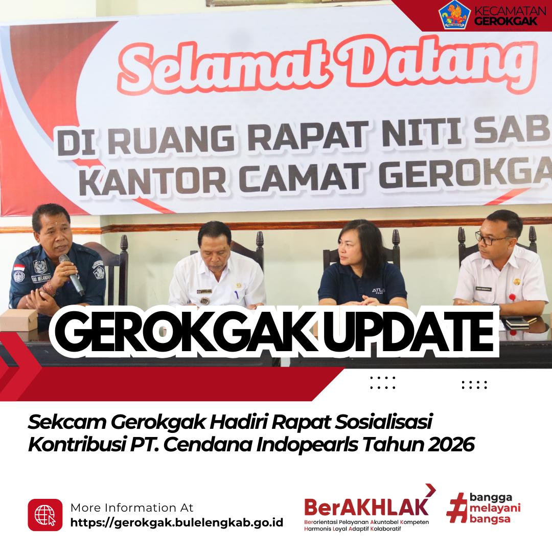 Gerokgak, 3 Desember 2025 — Sekretaris Camat Gerokgak, I Putu Dony Sugiartha, S.H., menghadiri Rapat Sosialisasi Kontribusi PT. Cendana Indopearls Tahun 2026 yang diselenggarakan di Ruang Rapat Niti Sabha, Kantor Camat Gerokgak. Kegiatan ini bertujuan memperkuat koordinasi antara perusahaan, pemerintah kecamatan, desa, serta kelompok masyarakat terkait rencana kontribusi perusahaan pada tahun 2026.
