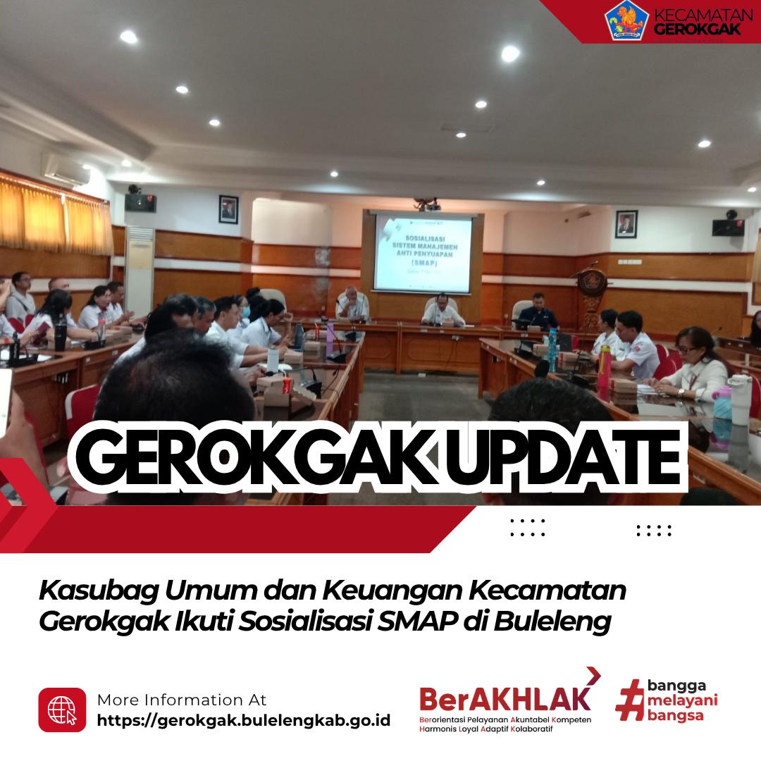 Buleleng, 15 April 2026 — Kasubag Umum dan Keuangan Kecamatan Gerokgak mengikuti kegiatan Sosialisasi Sistem Manajemen Anti Penyuapan (SMAP) yang diinisiasi oleh Inspektorat Kabupaten Buleleng, Rabu (15/04/2026). Kegiatan tersebut dilaksanakan di Gedung Unit IV Kantor Bupati Buleleng dan dihadiri oleh Inspektur Inspektorat, Sekretaris Daerah Kabupaten Buleleng, narasumber dari Badan Standardisasi Nasional Denpasar, serta seluruh perwakilan SKPD se-Kabupaten Buleleng.