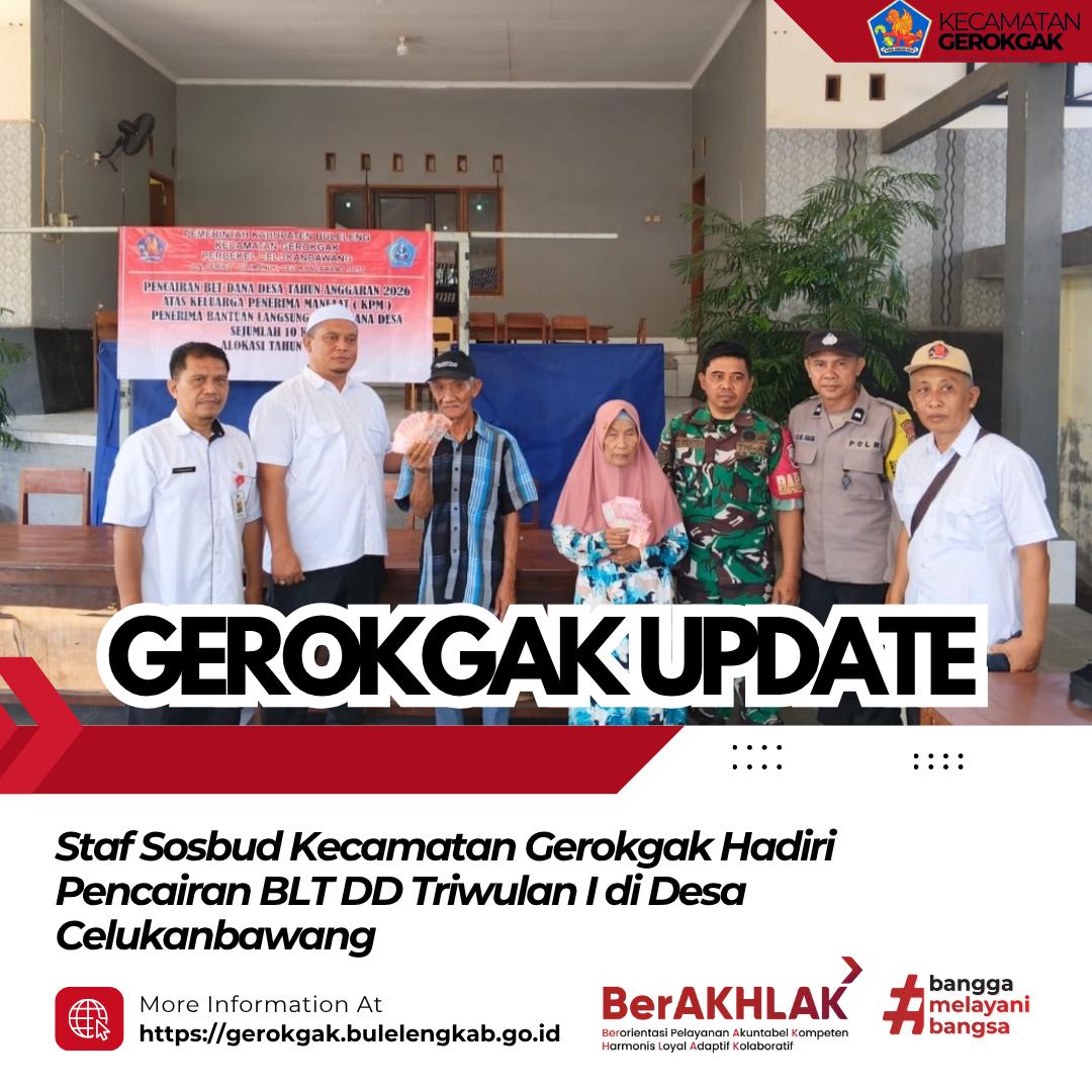 Gerokgak – Staf Seksi Sosial dan Budaya Kecamatan Gerokgak menghadiri kegiatan pencairan Bantuan Langsung Tunai Dana Desa (BLT DD) Triwulan I Tahun 2026 (Januari–Maret) yang dilaksanakan pada Rabu, 22 April 2026, bertempat di Desa Celukanbawang.