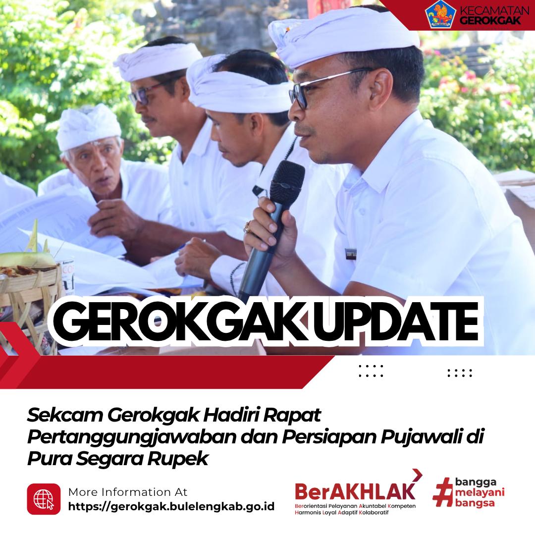 Sumberklampok – Sekretaris Camat Gerokgak menghadiri rapat pertanggungjawaban serta persiapan pelaksanaan pujawali yang akan dilaksanakan pada Purnama Jyestha, tanggal 1 Mei 2026. Rapat berlangsung di Wantilan Pura Kahyangan Jagat Segara Rupek, dengan dihadiri oleh PHDI Kecamatan Gerokgak, Perbekel dan Kelian Desa Adat Se kecamatan Gerokgak, Kelian Subak Sawah dan Abian Se Kecamatan Gerokgak. Kamis, 16 April 2026.