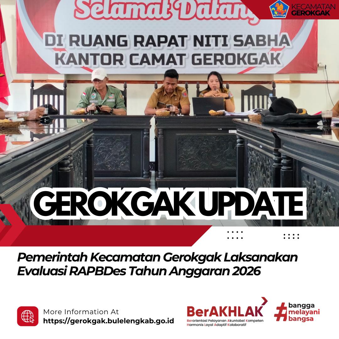 Senin, 22 Desember 2025, Pemerintah Kecamatan Gerokgak melaksanakan kegiatan Evaluasi Rancangan Anggaran Pendapatan dan Belanja Desa (RAPBDes) Tahun Anggaran 2026 yang bertempat di Ruang Rapat Niti Sabha Kantor Camat Gerokgak. Kegiatan ini diikuti oleh empat desa, yaitu Desa Gerokgak, Desa Tinga-Tinga, Desa Pemuteran, dan Desa Sanggalangit, sesuai dengan jadwal yang telah ditetapkan.
