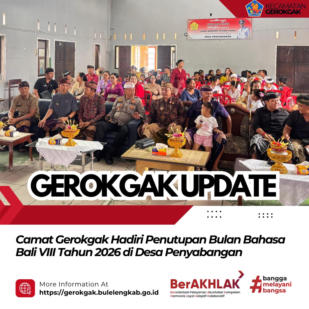 Penyabangan, 27 Februari 2026 – Camat Gerokgak I Gd Arya Rimbawa Giri, S.IP., M.AP., didampingi Kasi Sosial dan Budaya Kecamatan Gerokgak menghadiri kegiatan Penutupan Bulan Bahasa Bali VIII Tahun 2026 Tingkat Desa yang dilaksanakan di GOR Desa Penyabangan, Jumat (27/2/2026).