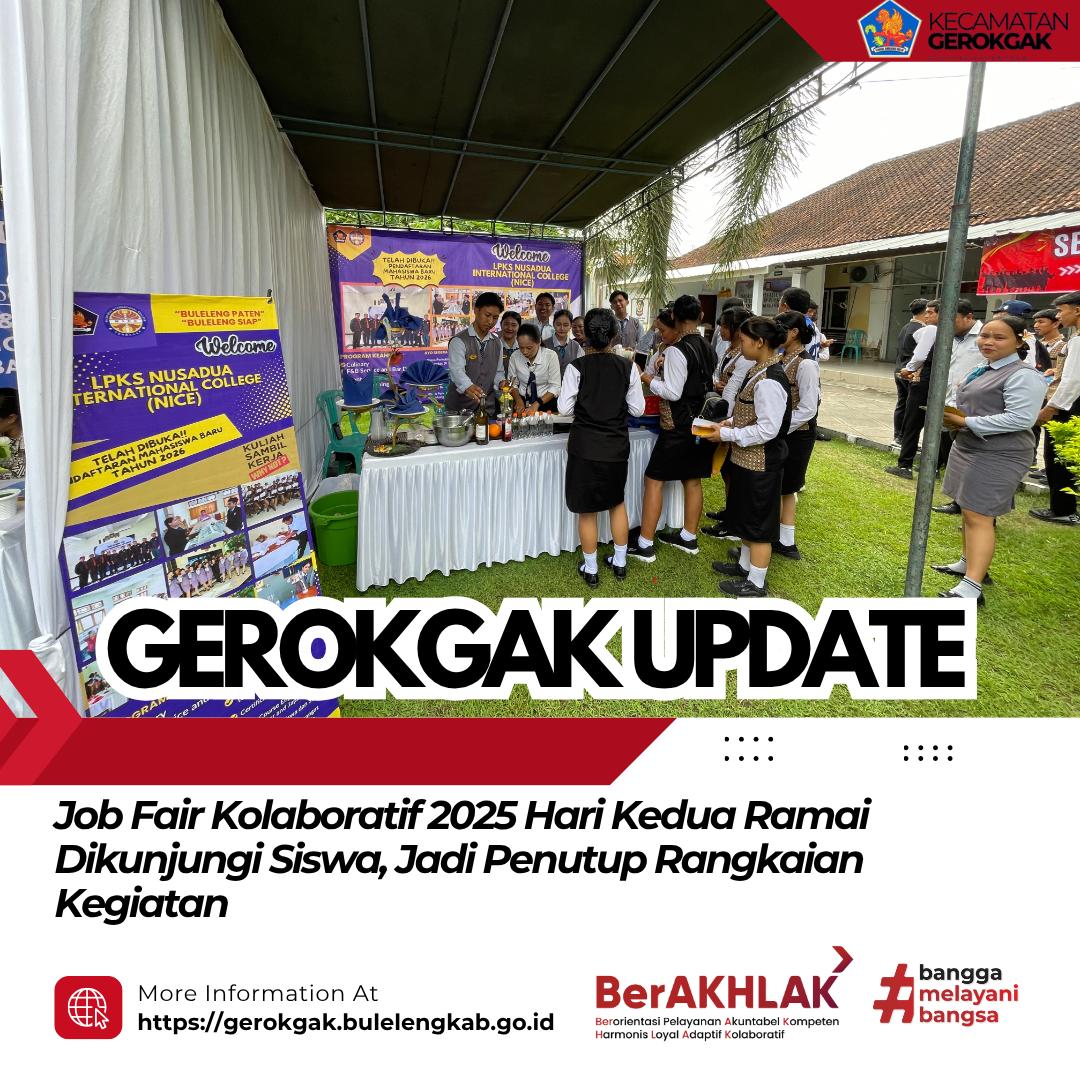 Gerokgak, 12 November 2025 – Gelaran Job Fair Kolaboratif 2025 yang berlangsung di Kecamatan Gerokgak resmi berakhir hari ini dengan antusiasme tinggi dari para pengunjung. Memasuki hari kedua sekaligus penutupan, kegiatan ini dipadati oleh siswa-siswi dari berbagai sekolah negeri maupun swasta di wilayah Kecamatan Gerokgak yang datang untuk mengenal dunia kerja dan peluang pelatihan.