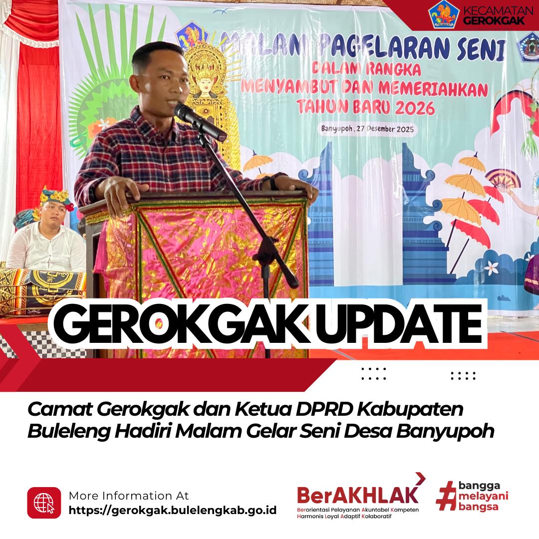 Banyupoh, 27 Desember 2025 — Camat Gerokgak, I Gd Arya Rimbawa Giri, S.IP., M.AP., bersama Ketua DPRD Kabupaten Buleleng menghadiri kegiatan Malam Gelar Seni (Seni Tabuh dan Tari) dalam rangka menyambut dan memeriahkan pergantian malam Tahun Baru 2026. Kegiatan ini diselenggarakan oleh Panitia Tetap Hari-Hari Besar Nasional dan Desa (PanTap Harnasdes) Desa Banyupoh dan bertempat di Aula Kantor Desa Banyupoh, Kecamatan Gerokgak, pada Sabtu malam (27/12).