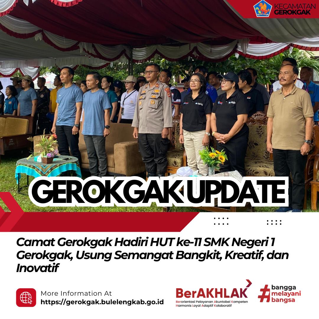 Banyupoh – Camat Gerokgak menghadiri peringatan Hari Ulang Tahun (HUT) ke-11 SMK Negeri 1 Gerokgak yang mengusung tema “SMK Bangkit, Kreatif, dan Inovatif”. Kegiatan ini dilaksanakan pada Selasa, 24 Februari 2026, bertempat di lingkungan SMK Negeri 1 Gerokgak, Desa Banyupoh.