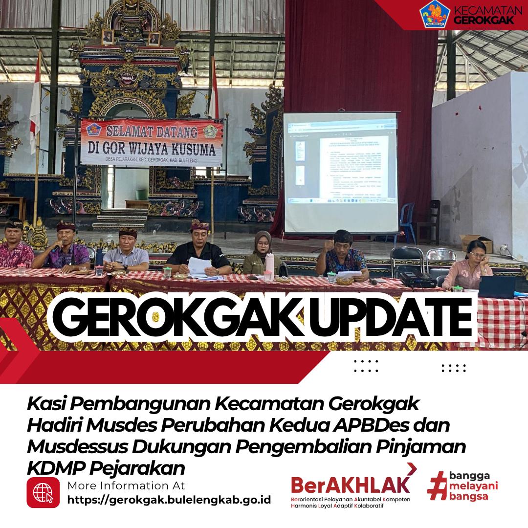 Pejarakan, 30 Oktober 2025 — Kasi Pembangunan Kecamatan Gerokgak I Made Pasek Widiana, S.Si. bersama staf menghadiri kegiatan Musyawarah Desa (Musdes) Penyepakatan Rancangan Perubahan Kedua APBDes Tahun Anggaran 2025 serta Musyawarah Desa Khusus (Musdessus) untuk persetujuan dukungan pengembalian pinjaman KDMP Pejarakan, yang dilaksanakan di Gor Wijaya Kusuma Desa Pejarakan.