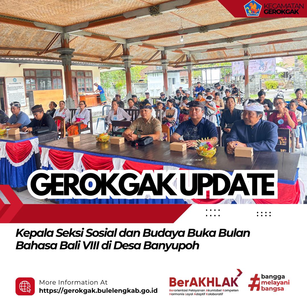 Banyupoh – Kepala Seksi Sosial dan Budaya Kecamatan Gerokgak menghadiri Kegiatan Bulan Bahasa Bali ke VIII Tahun 2026 yang diselenggarakan di Desa Banyupoh pada Jumat, 13 Pebruari 2026. Kegiatan ini merupakan bagian dari pelestarian bahasa, aksara, dan sastra Bali di tingkat desa.