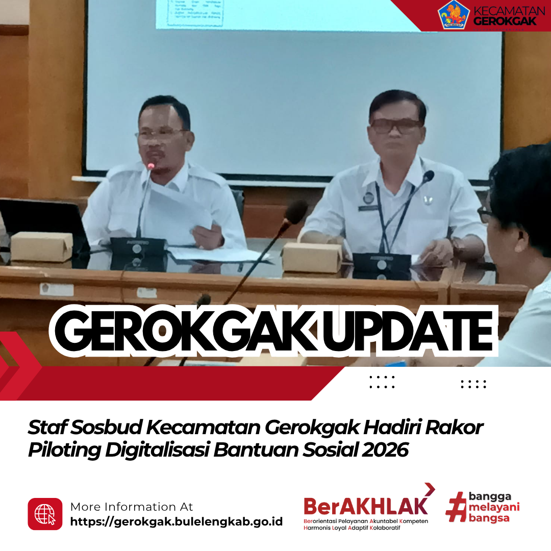 Gerokgak, 1 April 2026 — Staf Seksi Sosial dan Budaya (Sosbud) Kecamatan Gerokgak menghadiri undangan Rapat Koordinasi Piloting Digitalisasi Bantuan Sosial Tahun 2026 yang dilaksanakan di Gedung Unit IV Lantai 2 Kantor Bupati Buleleng, pada Rabu (1/4).