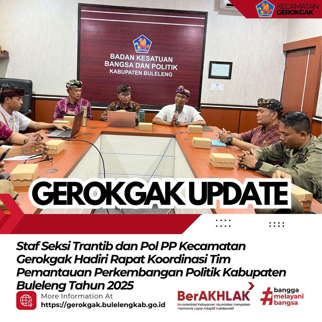 Buleleng, 23 Oktober 2025 — Staf Seksi Trantib dan Pol PP Kecamatan Gerokgak menghadiri Rapat Koordinasi Tim Pemantauan Perkembangan Politik Kabupaten Buleleng Tahun 2025 yang dilaksanakan di Ruang Rapat Badan Kesatuan Bangsa dan Politik (Kesbangpol) Kabupaten Buleleng, Kamis (23/10).