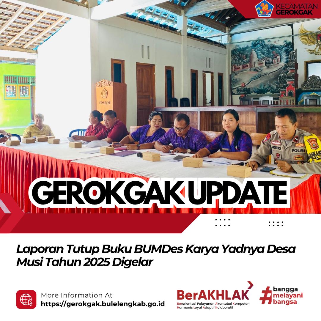 Gerokgak, 31 Maret 2026 — Staf Seksi Pembangunan Kecamatan Gerokgak menghadiri undangan kegiatan laporan tutup buku Badan Usaha Milik Desa (BUMDes) Karya Yadnya Tahun 2025 yang dilaksanakan di Aula Kantor Perbekel Desa Musi.