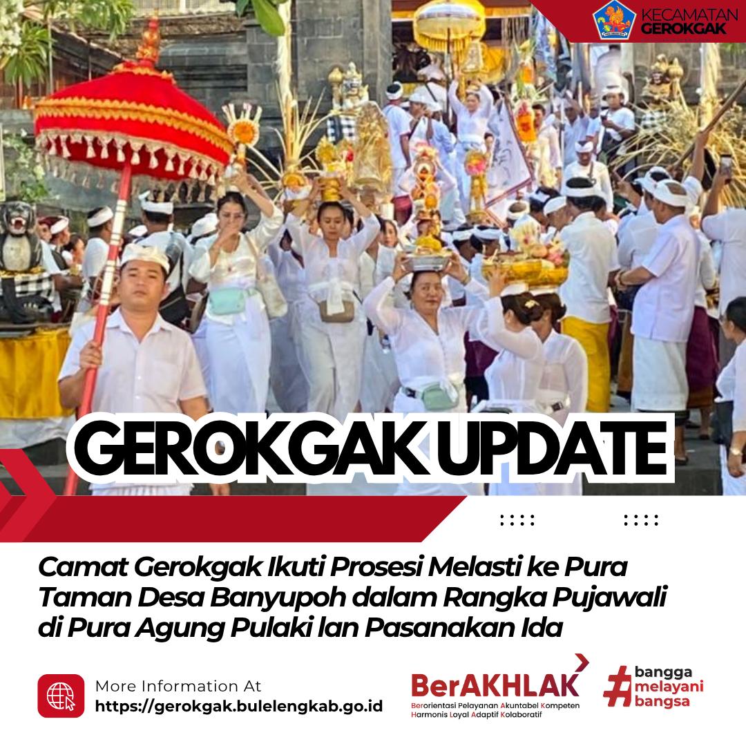 Banyupoh, 5 Oktober 2025 - Dalam rangka menyambut rangkaian Pujawali di Pura Agung Pulaki lan Pasanakan Ida, Camat Gerokgak bersama Sekcam Gerokgak dan staf mengikuti kegiatan prosesi Melasti atau Mesucian yang dilaksanakan di Pura Taman, Desa Banyupoh.