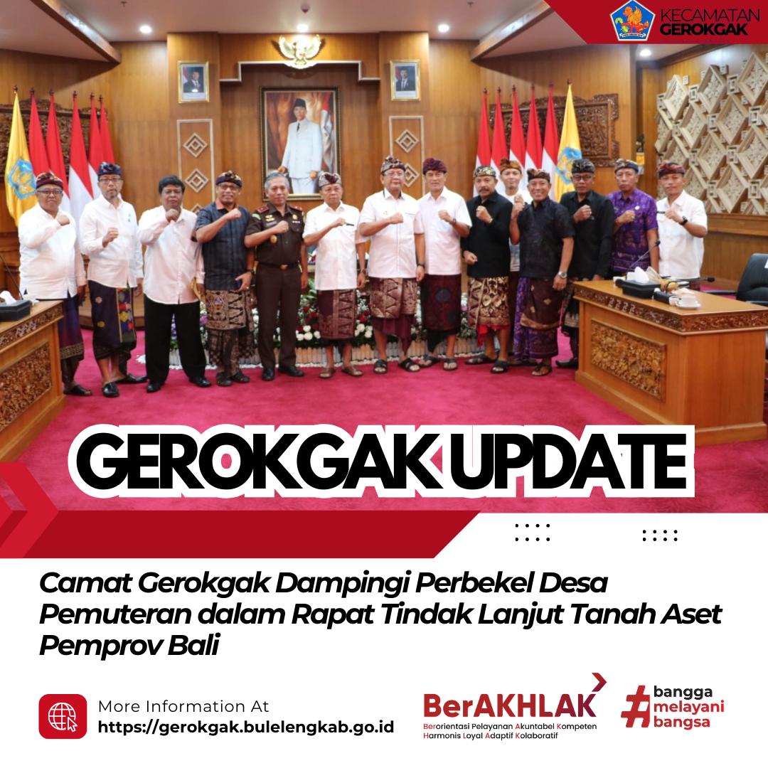 Denpasar — Camat Gerokgak I Gd Arya Rimbawa Giri, S.IP., M.AP. mendampingi Perbekel Desa Pemuteran dalam rapat pembahasan tindak lanjut tanah aset Pemerintah Provinsi Bali eks Hak Guna Usaha (HGU) Nomor 1 Desa Pemuteran. Rapat tersebut dilaksanakan pada Kamis, 22 Januari 2026, bertempat di Gedung Kerta Sabha, Jalan Surapati Nomor 1, Denpasar.