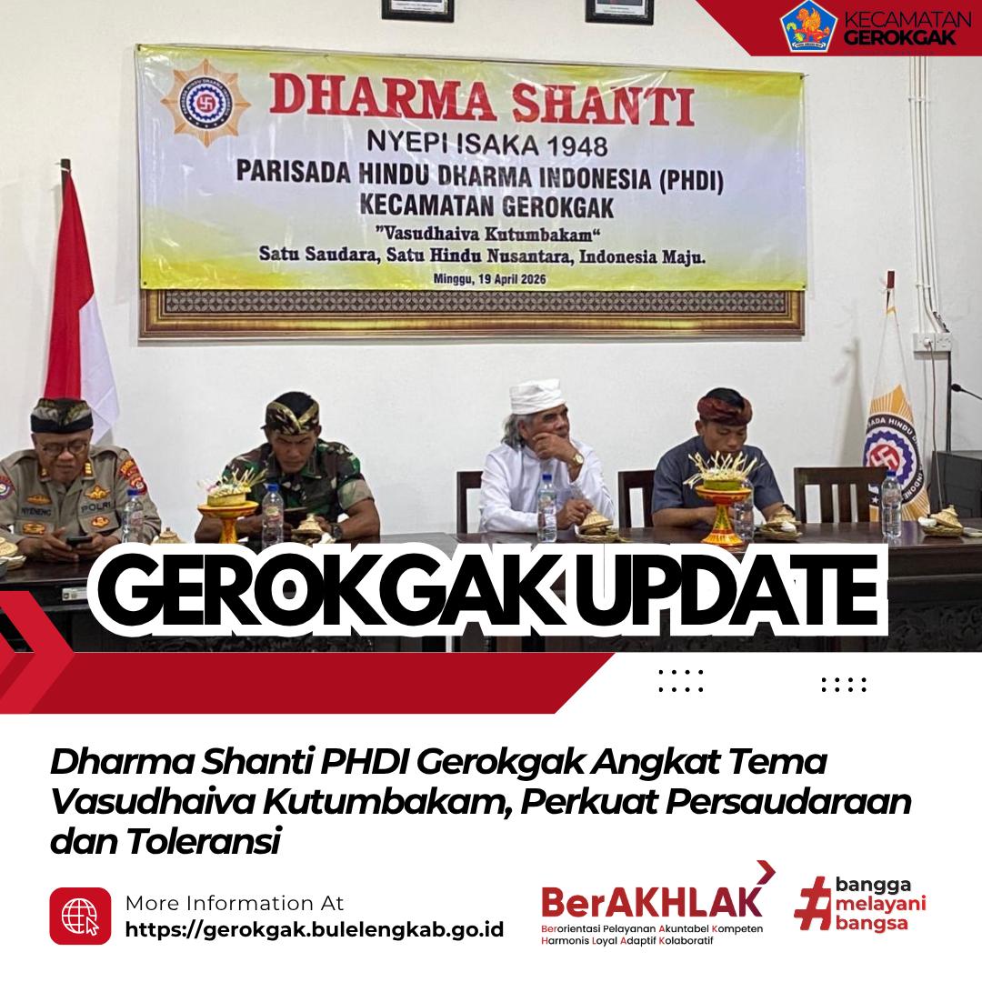 Sanggalangit — Camat Gerokgak menghadiri kegiatan Dharma Shanti yang diselenggarakan oleh Parisada Hindu Dharma Indonesia (PHDI) Kecamatan Gerokgak, bertempat di Aula Kantor Desa Sanggalangit, Minggu (19/4). Kegiatan ini mengusung tema “Vasudhaiva Kutumbakam” yang bermakna seluruh umat manusia adalah satu keluarga besar.