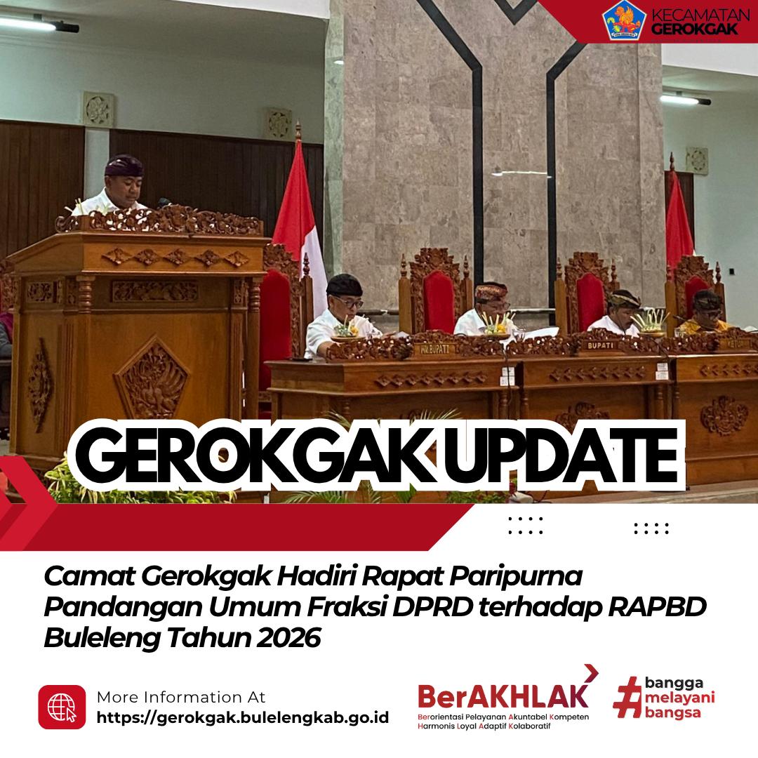 Buleleng, 6 November 2025 – Camat Gerokgak menghadiri rapat paripurna penyampaian pandangan umum fraksi-fraksi DPRD Kabupaten Buleleng terhadap Rancangan Anggaran Pendapatan dan Belanja Daerah (RAPBD) Kabupaten Buleleng Tahun Anggaran 2026, serta mendengarkan jawaban Bupati Buleleng atas pandangan fraksi-fraksi DPRD tersebut.