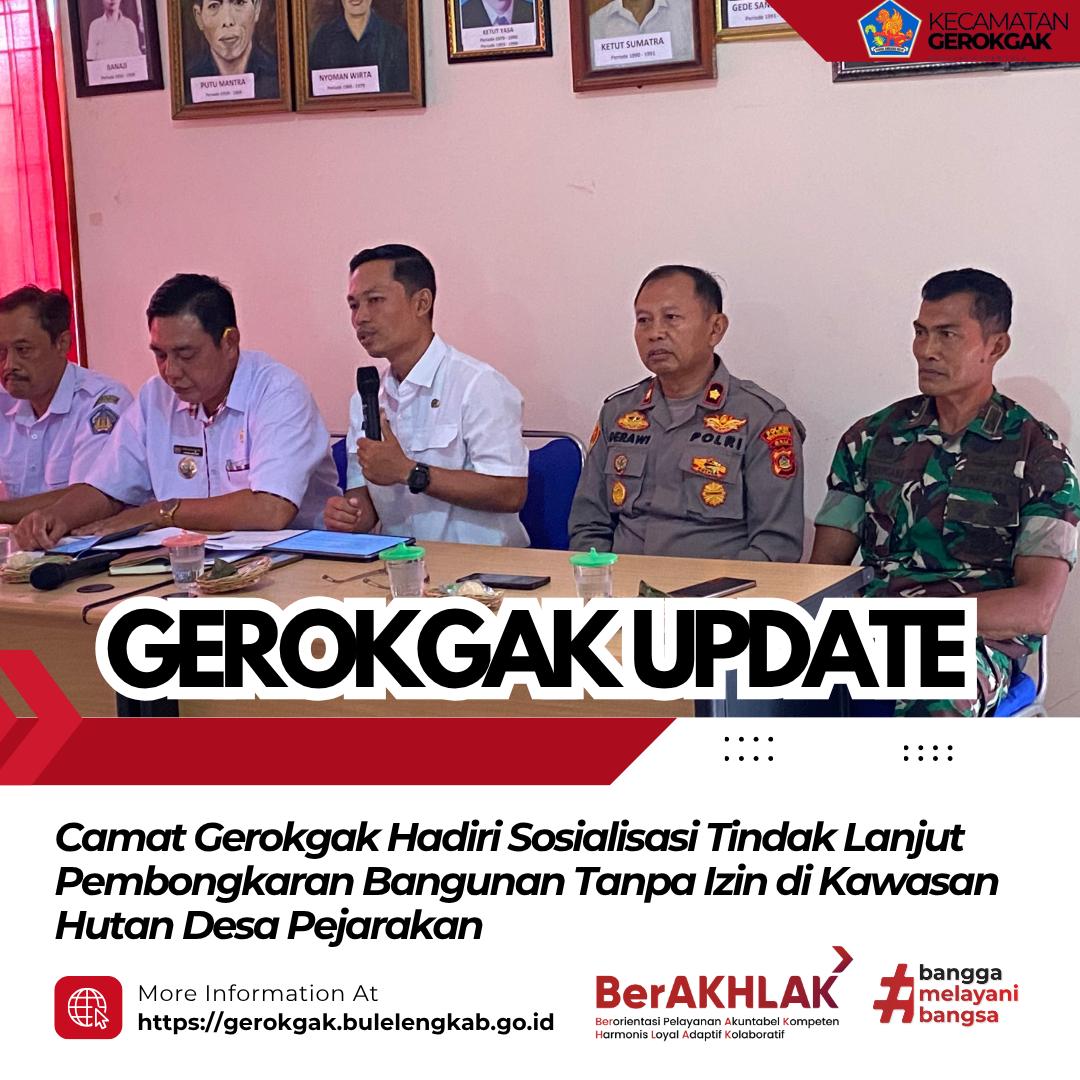Pejarakan, 22 April 2026 – Camat Gerokgak menghadiri rapat sosialisasi tindak lanjut terkait peringatan pembongkaran bangunan yang berlangsung di Desa Pejarakan. Kegiatan ini dilaksanakan sebagai upaya menindaklanjuti temuan adanya bangunan yang tidak memiliki izin di kawasan hutan wilayah desa setempat.