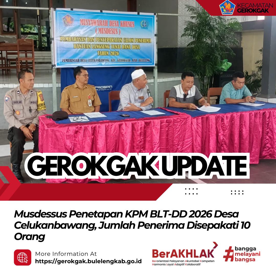 Gerokgak – Staf Seksi Sosial dan Budaya Kecamatan Gerokgak menghadiri undangan kegiatan Musyawarah Desa Khusus (Musdessus) Penetapan Keluarga Penerima Manfaat Bantuan Langsung Tunai Dana Desa (KPM BLT-DD) Tahun 2026 yang dilaksanakan pada Senin, 9 Maret 2026, bertempat di Balai Desa Celukanbawang, Kecamatan Gerokgak.