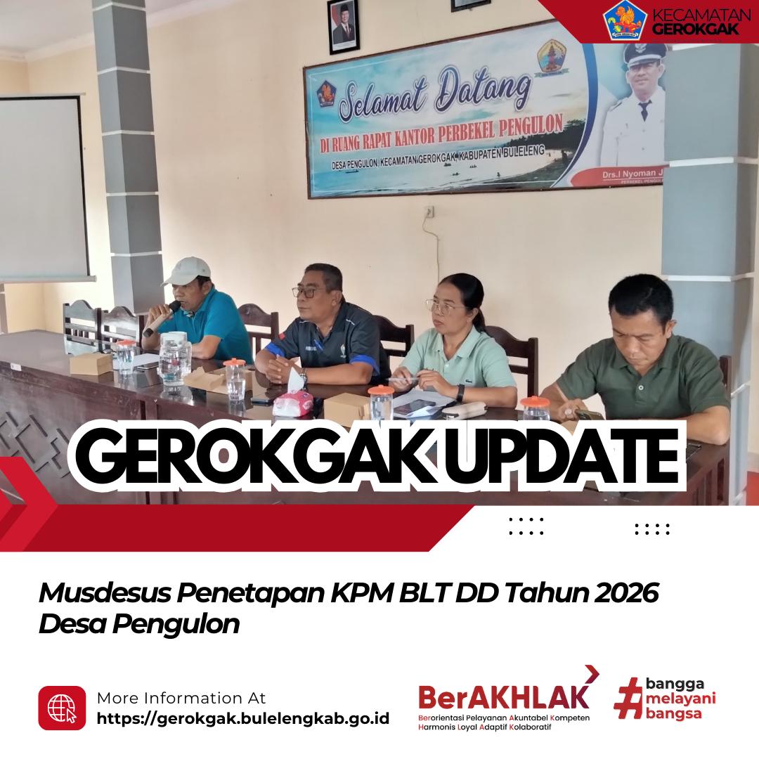 Pengulon, 27 Februari 2026 – Staf Seksi Sosial dan Budaya Kecamatan Gerokgak menghadiri kegiatan Musyawarah Desa Khusus (Musdesus) evaluasi, verifikasi, pembahasan, dan penyepakatan Keluarga Penerima Manfaat (KPM) Bantuan Langsung Tunai Dana Desa (BLT DD) Tahun 2026 yang dilaksanakan di Kantor Desa Pengulon.