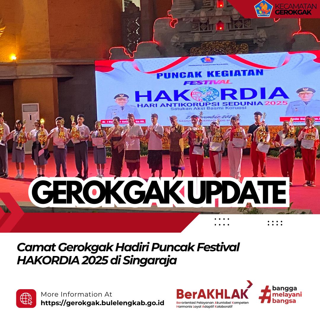 Buleleng, 27 November 2025 — Camat Gerokgak, I Gd Arya Rimbawa Giri, S.IP.,M.AP. menghadiri acara puncak Festival HAKORDIA (Hari Anti Korupsi Sedunia) 2025 yang berlangsung di Gedung Kesenian Gde Manik Singaraja. Kegiatan tahun ini mengusung tema “Satukan Aksi, Basmi Korupsi”, sebagai bentuk komitmen bersama dalam mendorong budaya antikorupsi di Kabupaten Buleleng.